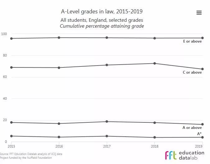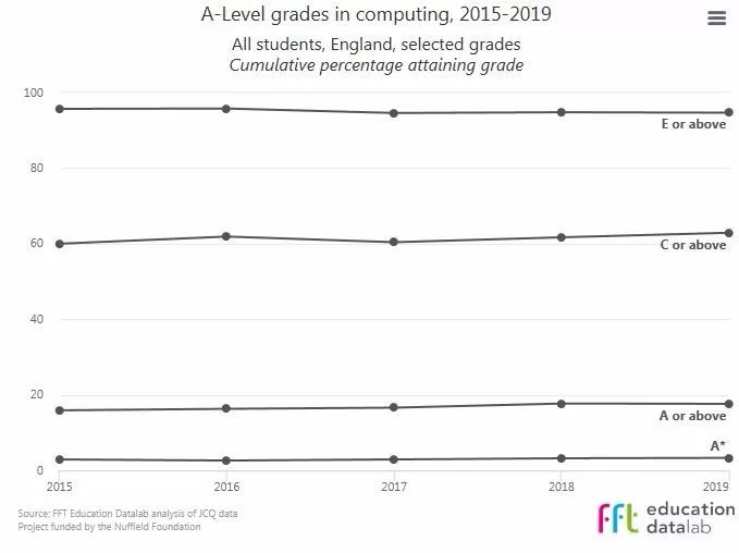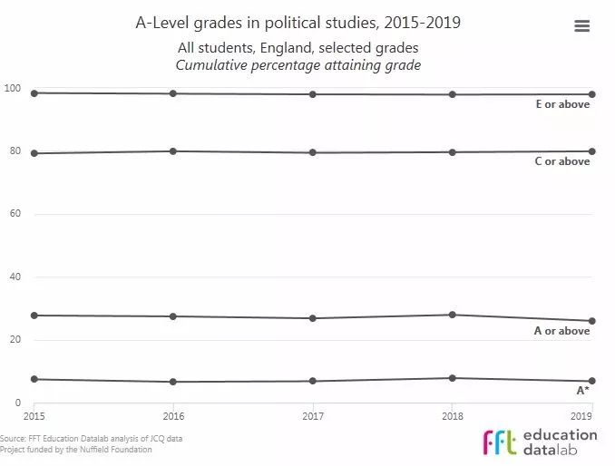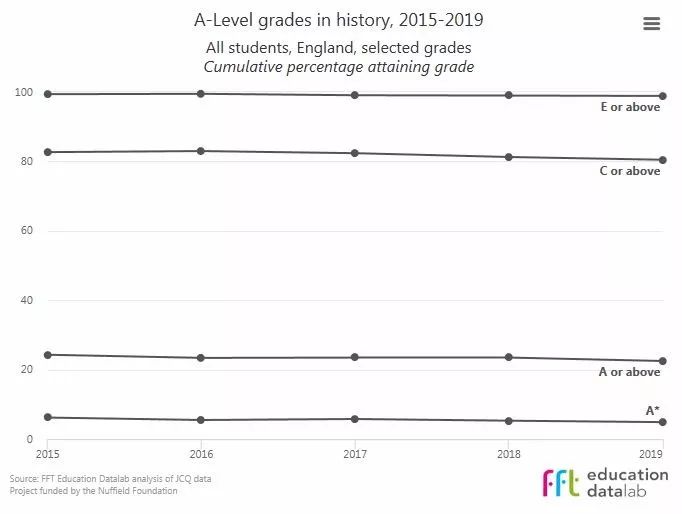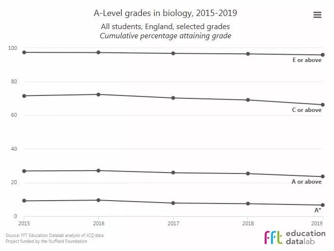 英国学生整体A*比例将近10%,A-A*比例为25%-27%之间,E以上及格率在90%以上。