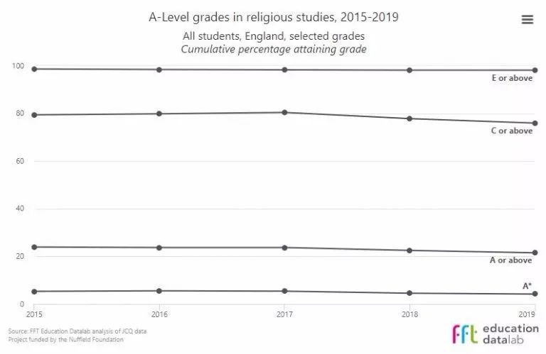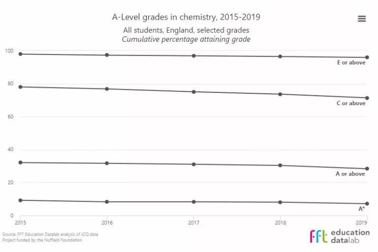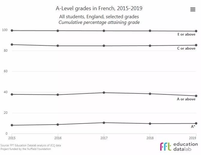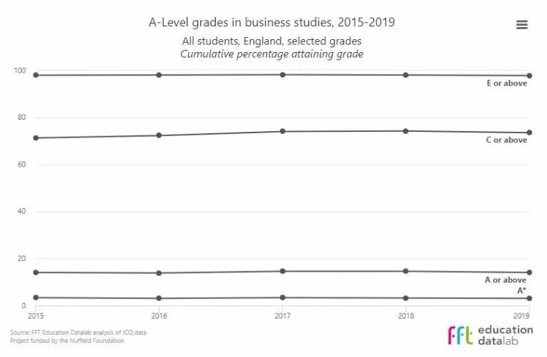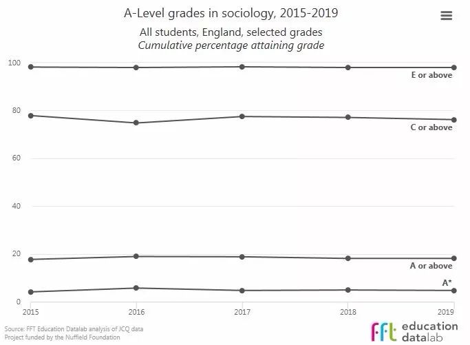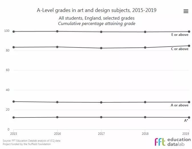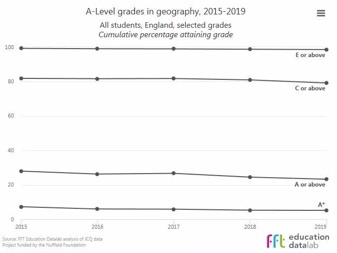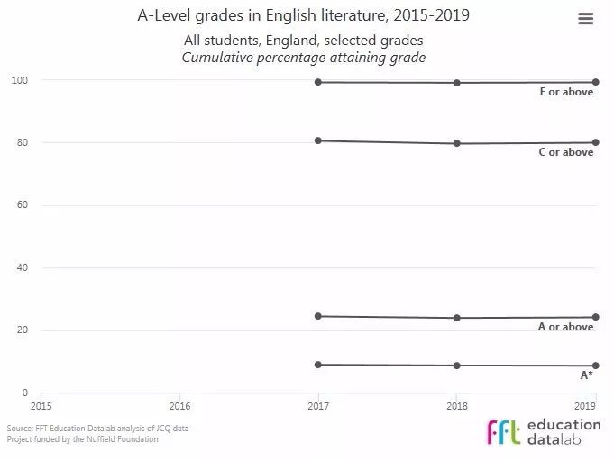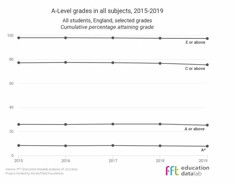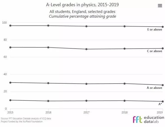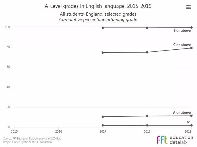 英格兰地区,今年A-level成绩C或以上学生比例降至2015年以来的最低点,这一数字为75.5%。