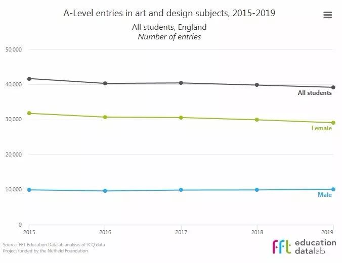 艺术设计相关科目考生人数,从去年的39,848下降到今年的39,219。