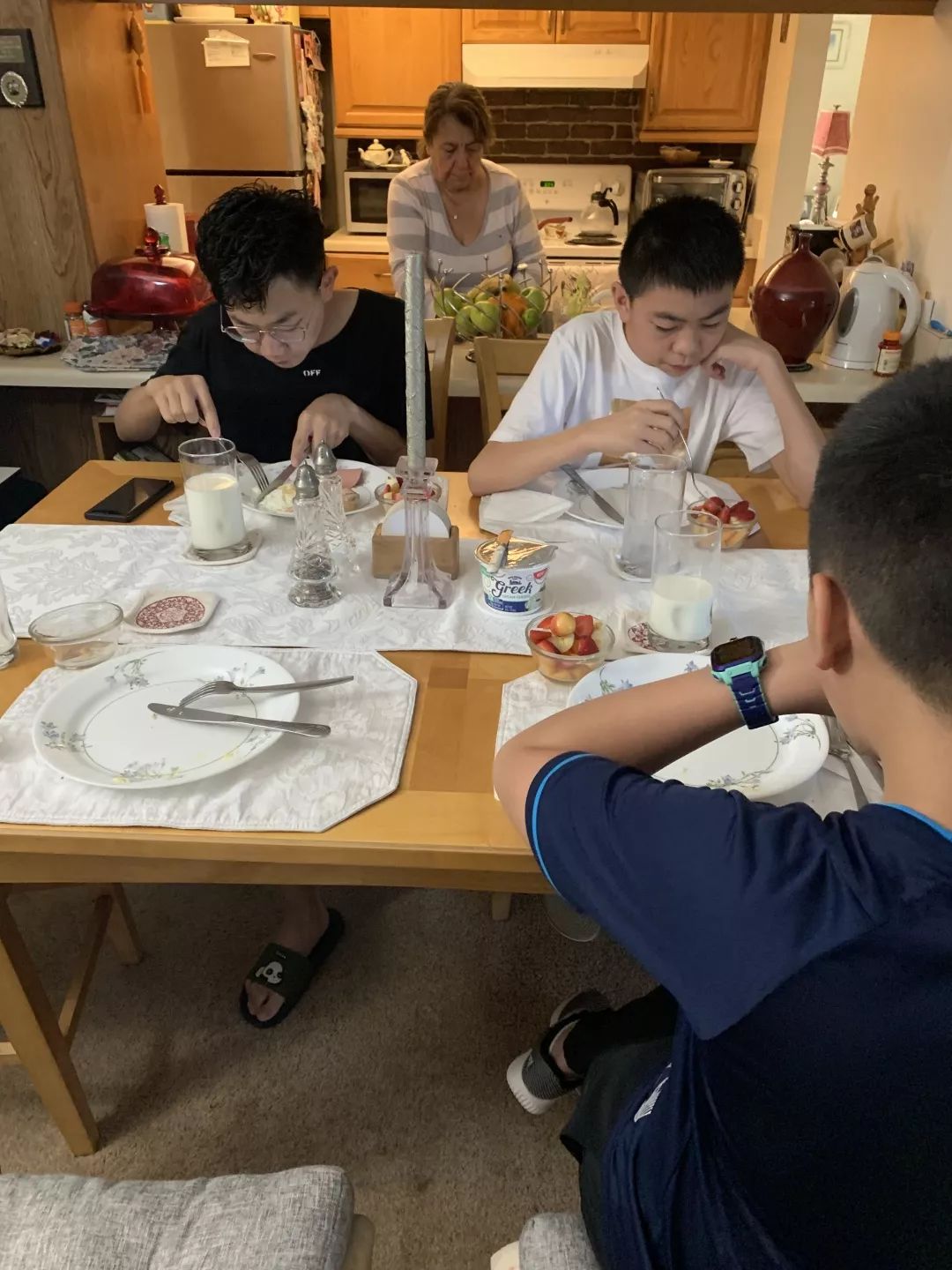 上午第一节课魏禹哲和杨格序是舞蹈,魏禹哲明显感觉到不喜欢,也不跟着跳,等中午的时候和他聊一聊,杨格序还可以,一直也在配合着老师。高凯沅和许凯东是艺术,因为领队老师没法进教室,只能在外面观察,他俩一直很积极配合老师,按照老师的要求在上课。刘维宽和郭阳阳是烹饪课,上课在一个厨房里,看着他俩也能够比较配合老师,毕竟这样的课程在国内是没有的。