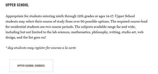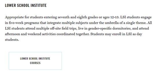 简称LSI,适合即将进入7-8年级12-13岁的学生,项目时长5周,该项目在同一主题下分若干个科目,包括:Anatomy of a Crime犯罪分析,Archaeology in Action考古行动,Express Yourself: A Study of Performance and Film表演与电影分析,Forests, Mountains, & Beaches: Exploration & Inspiration:New England Field Ecology & Nature Writing森林、山峦和海滩:探索欲启发:新英格兰野外生态与天然文学,Revolution! Continuity and Change in Our World革命!世界的连续性与变化,Charting the Natural World: Marine Biology Meets Math描绘自然世界:海洋生物学遇见数学,Bridges to English: Connecting our Past and Present桥梁英语:连接过去和现在。