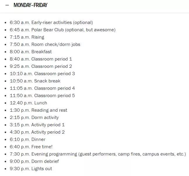 爬山并野外宿营;中学探访(校园参观和招生讲座):菲利普斯埃塞特、圣保罗中学、霍尔德内斯、普罗科托尔等;爬山;野外探险;水上乐园、Canobie湖公园、职业棒球比赛。
