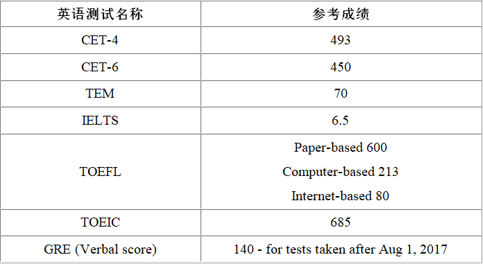 该项目的申请人应具有一定的英语基础,并在申请时提供英语成绩单。可接受的英语成绩证明包括: