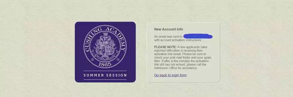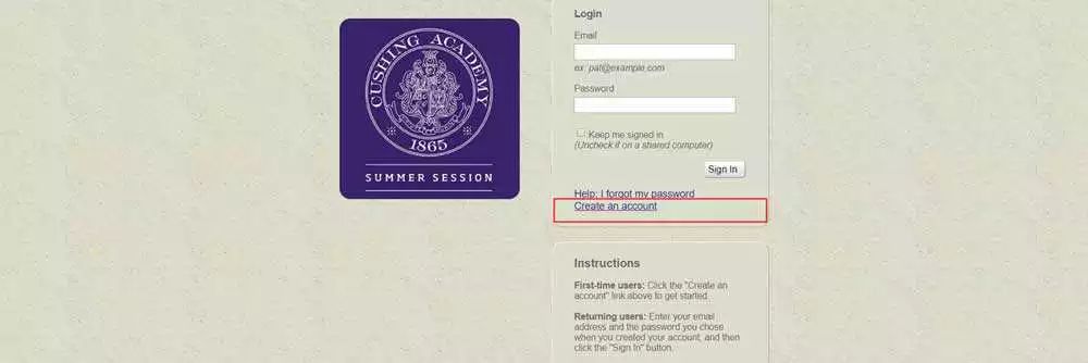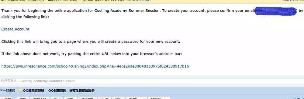 申请页面入口:https://www.cushing.org/page/summer进入后看到登录界面,分别是登录(Log in)和创建新账户(Create an account)。对大多数中国学生和家长来说,下一步即将进入创建新账户。点击创建新账户(Create an account),进入账户创建页面,需要邮件地址、姓名、生日。之后会有一封邮件发至申请用的邮箱中,点击“Creative Account”或复制网址链接在浏览器中打开,创建密码后进入正式申请界面。2
