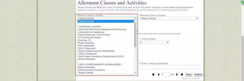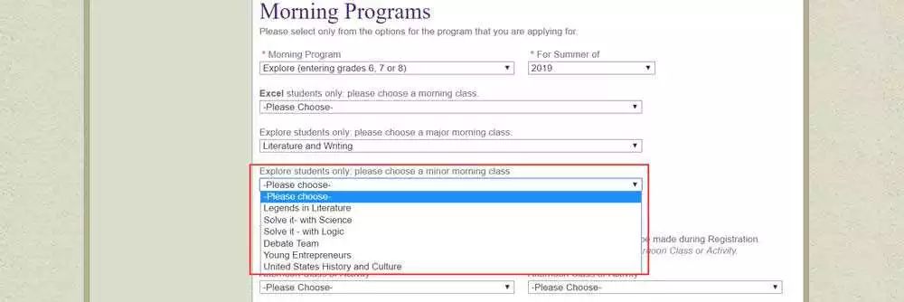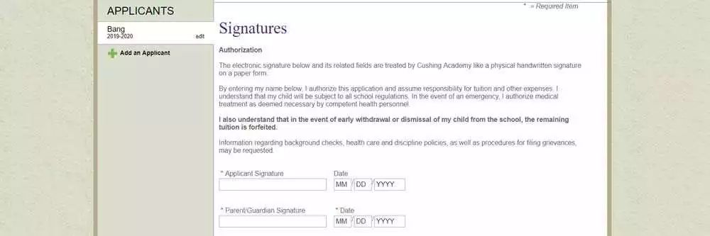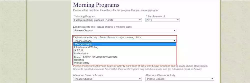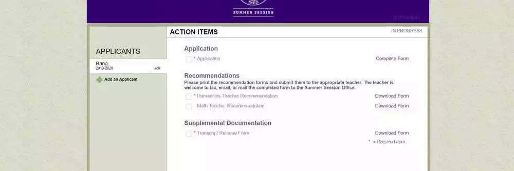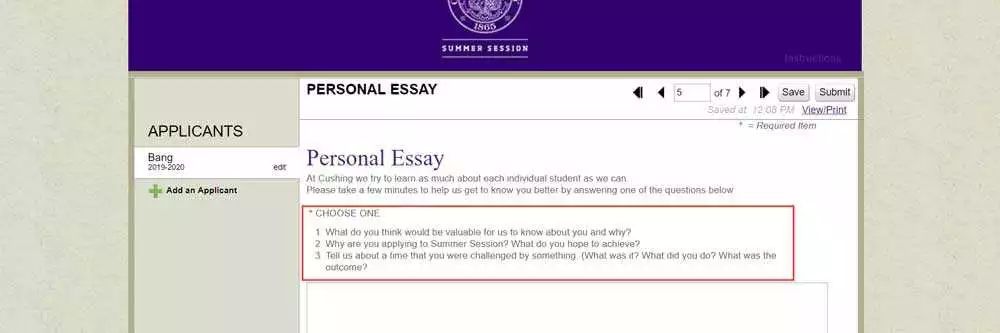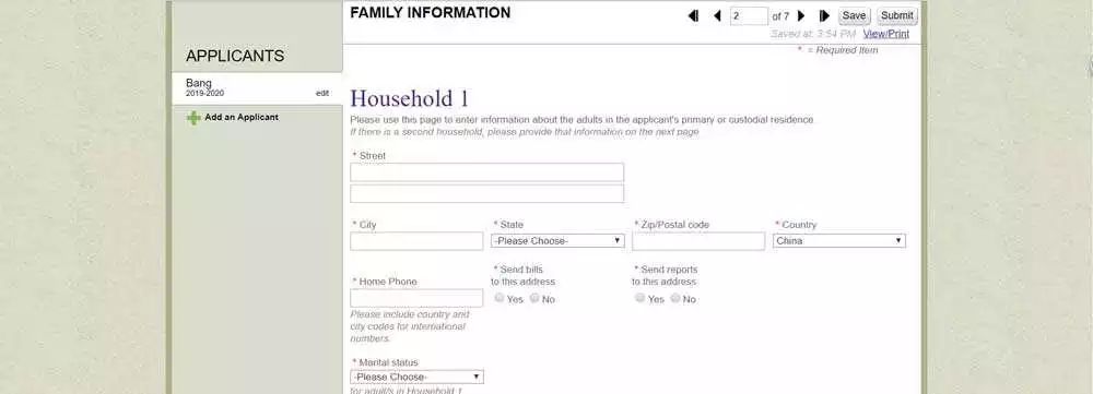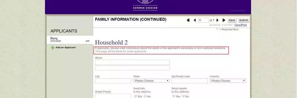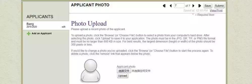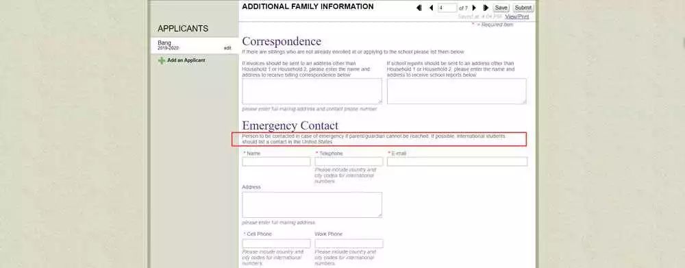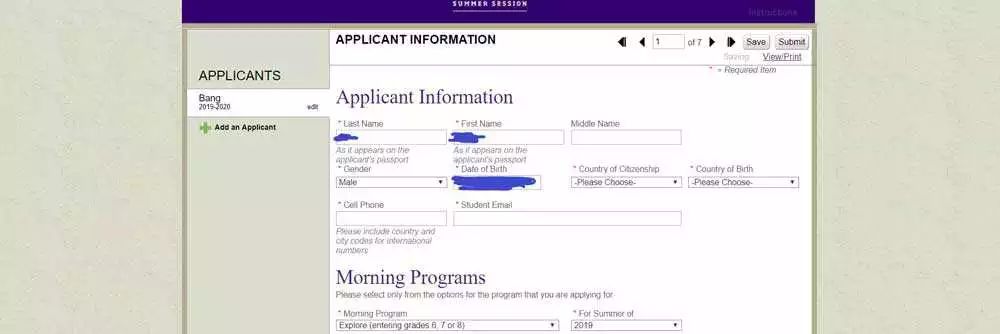 点击“Add Applicant”,进入以下页面:根据学生信息填写完成后点击“Save”,进入具体申请信息界面:申请内容一共分为三个部分:申请表(Application)、推荐信(Recommendations)和补充文件(Supplemental Documentation)。该校的补充文件主要为成绩单(Transcript Release Form)。(1)申请表填写点击申请表格部分的“Complete Form”,开始填写申请表,一共7页。第1页:第1页包括需要填写学生信息(Applicant Information)、选择上午课程(Morning Programs)、选择下午课程和活动(Afternoon Classes and Activities)、当前学校信息(Current School)和一般信息(General Information)。选择上午课程是,根据学生的年级和课程偏好进行选择。本例选择10岁年龄学生适合的Explore课程,上午课程需要选一门主修课和一门辅修课。选择主修课的下拉界面如下:选择辅修课的下拉界面如下:选择下午课程和活动的下拉界面如下:完成后点击“Save”并点击下一页进入第2页。第2页:本页主要填写家庭信息,包括联系地址和父母等监护人信息。第3页:一般情况下,这一页可以不需要填写,有特殊情况的学生可以选择填写。第4页:本页主要需要填写紧急联系人,申请页面提示,如可能最好填写在美国的联系人信息,以防特殊情况下学校可以联系到。第5页:填写个人陈述,学校提供了三个填写的方向,家长和学生可以选择自己擅长的填写,未明确要求字数。申请过程可以中断,建议填写时保存,将个人陈述准备好后继续。也可以根据麦驰游学的攻略,提前做好准备。今年的个人陈述题目如下:(1)What do you think would be valuable for us to know about you and why?(2)Why are you applying to Summer Session? What do you hope to achieve?(3)Tell us about a time that you were challenged by something. (What was it? What did you do? What was the outcome? 第6页:第7页:上传申请学生的近期照片3