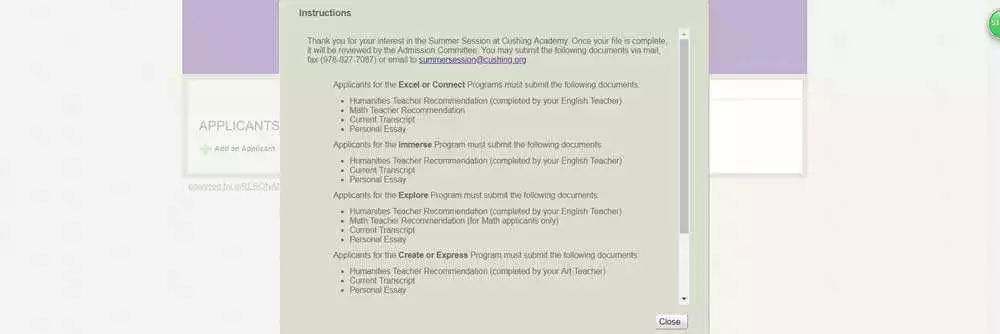 正式申请页面的将跳出申请指导(Instruction)弹框,对重要事项进行提醒:(1)申请Excel或者Connect课程需要提交以下文件Applicants for the Excel or Connect Programs must submit the following documents:
