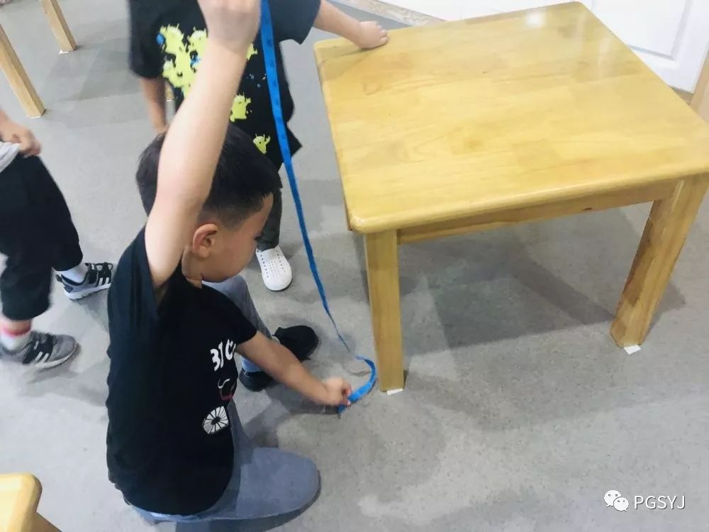 对于生活中遇到的物体的长短、高矮、距离等问题,孩子们会利用目测去进行判断,也会用手、脚、辅助物进行比较。紧接着,开启他们特有的测量模式,床、桌子、电视、玩具、垫子........孩子们开启大搜罗模式。