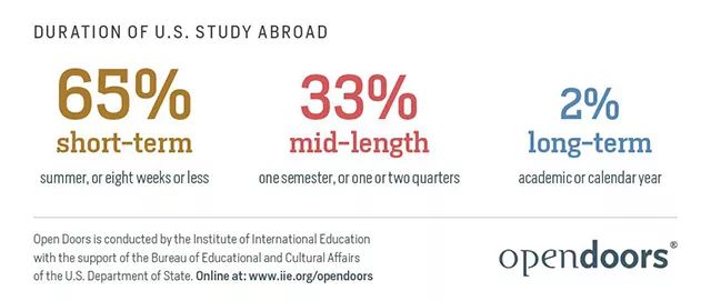 2018年OpenDoors的调研报告显示65%的美国学生选择在暑假或者8周甚至更短的时间进行短期游学