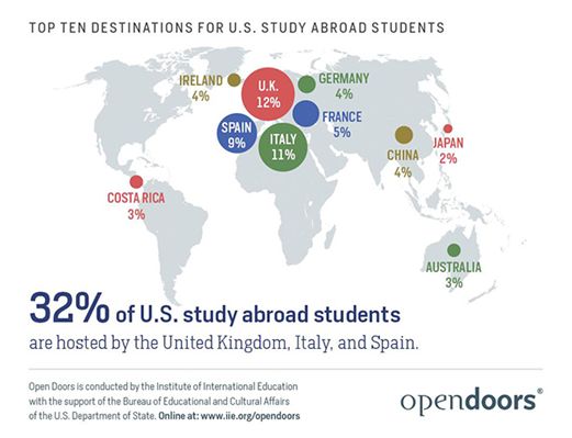 欧洲始终是美国学生的首选目的地,拥有超过一半的美国学生。英国有近4万名美国学生,占总人数的12%,位居榜首;意大利约3.5万名,排名第二;西班牙约3.12万名,排名第三;中国排名第六,约1.1万名。其他国家中,美国学生对古巴的兴趣增长最大,增长21.8%,达到4600人左右。希腊、印度、墨西哥和澳大利亚也是对于美国学生最具吸引力的国家之一。