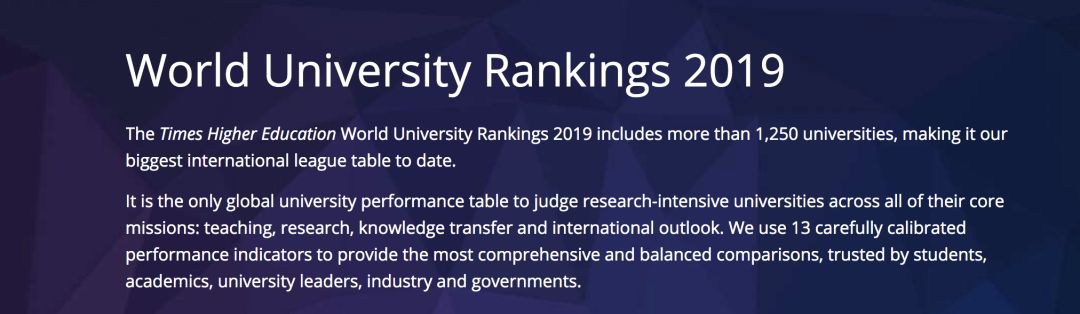2019年的排名是基于2018年11月至2019年2月期间进行的一项调查,邀请了来自全球138个国家和地区的10162名全球知名学者共同参与,一共有105所高校入围。