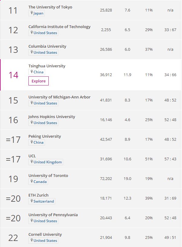 中国内地高校中,清华大学和北京大学表现最为优秀,分别位列世界14名和并列17名。复旦大学、中国科学技术大学和上海交通大学在71-80名的区间,浙江大学位于81–90名的区间。