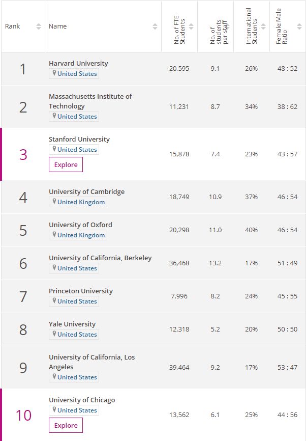 Highlights在排行榜前100名中,42所大学来自于美国,10所大学来自于英国,中国有10所大学进榜,澳大利亚有6所大学进榜,巴西也有1所学校上榜,实现了零突破。排名前10名大学中,美国高校占了8席,学校排名与去年相比基本持平,哈佛大学连续8年蝉联榜首。约翰霍普金斯大学进步迅速,从21名跃升至16名,顶替了宾夕法尼亚大学的位置,宾夕法尼亚大学则名列第20名。