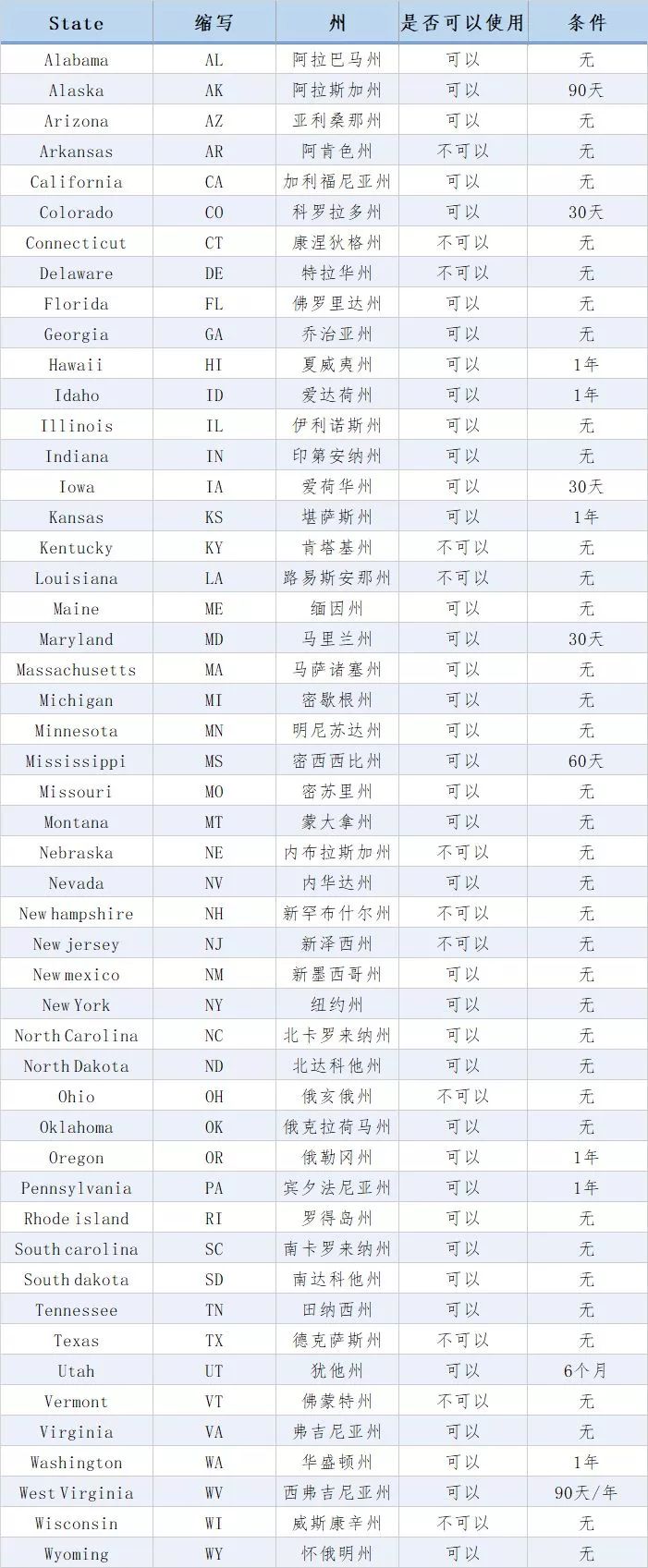 在美国,不同的州对国际游客是否能够自驾、具体天数等要求各不相同,具体如下: