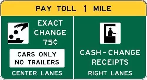 前方1英里处有收费亭(pay toll 1 mile)