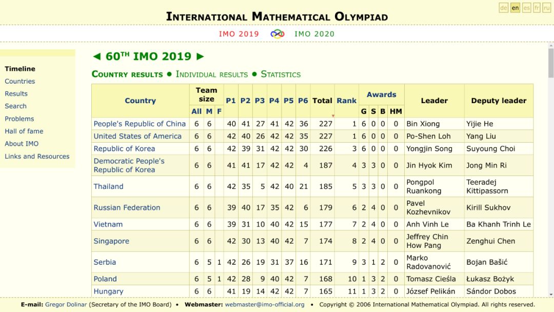 2019年IMO前11名国家的成绩:
