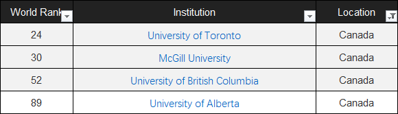 此次排行榜的2000所高校中,加拿大共有4所院校上榜前100名,分别是多伦多大学、麦吉尔大学、英属哥伦比亚大学、阿尔伯特大学。