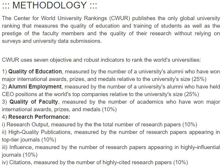 CWUR在不依赖调查和提交的大学数据的情况下,根据七个因素对大学进行排名:教学质量、校友就业、师资质量、研究成果、高质量出版物、影响力和引文。