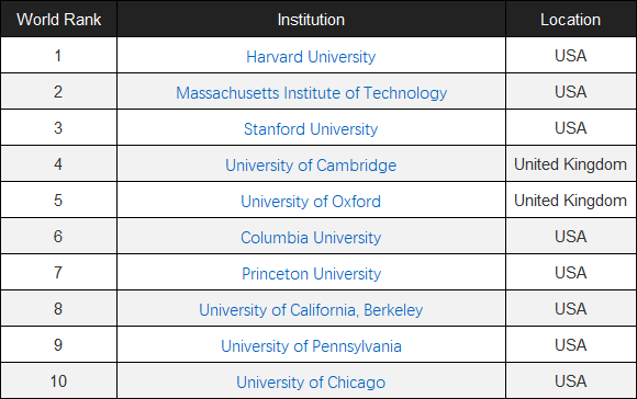 其余进入前十名的学校依次为剑桥大学、牛津大学、哥伦比亚大学、普林斯顿大学、加州大学伯克利分校、宾夕法尼亚大学以及芝加哥大学。