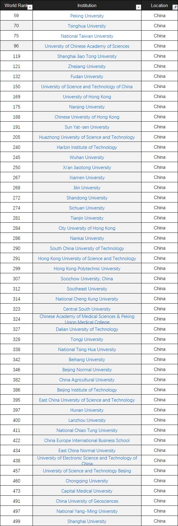 值得一提的是,中国内地入榜的高校中有41所高校进入世界前500,有3所大学进入世界前100名。其中,位居中国内地大学第一名的是北京大学,位列世界第59名,其次是清华大学(第70名),排名第三的是中国科学院(第96名)。另外进入中国内地大学排行前10名的大学分别是是上海交通大学、浙江大学、复旦大学、中国科学技术大学、南京大学、中山大学以及华中科技大学。