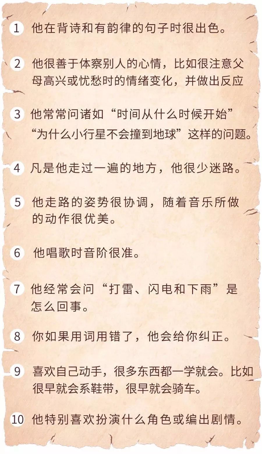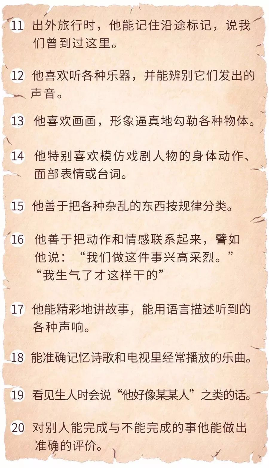 具有言语天赋的孩子,在背诗和有韵律的句子时很出色;如果我们平时说话用错词,他会纠正你;能精彩地讲出故事。平时我们可以通过这些方法,加强孩子的语言才能:多给孩子提供一些故事性的绘本、书籍,在给孩子讲绘本时,刻意加入更丰富、更高级的词汇,比如同样是描绘云朵,我们可以用“白色”、“柔软”、“轻盈”、“绵密”等等;出门游玩时,我们可以请孩子描绘一个对象,一件事,一个自然现象等,鼓励孩子用语言来描述他的所见所想。加入更多细节的描写,比如描绘人物心理,动作发展,为孩子的语言输出积累词汇量。多带孩子出去玩,鼓励孩子社交,为孩子提供更多和其他人交流的机会。