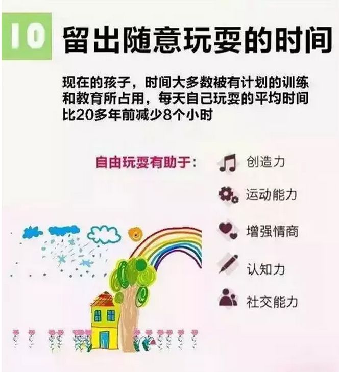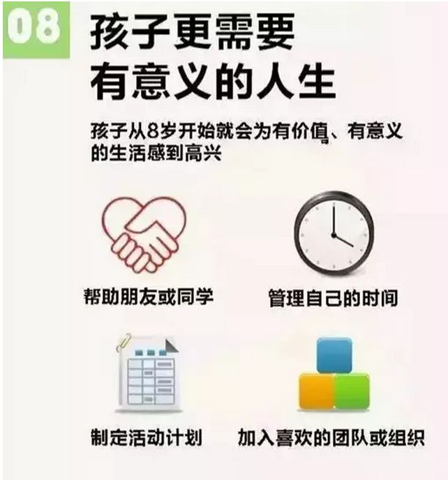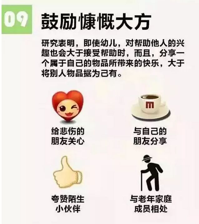 除了感受幸福,父母还要教会孩子积累幸福,如身体健康就是幸福,一家人开心地生活在一起就是幸福等等。 就像优秀是一种习惯一样,幸福也需要培养。父母应该多抽一点时间陪伴在孩子身边,给孩子讲讲故事,和孩子一起做游戏,带孩子外出游泳。让孩子充满安全感,感受到来自父母浓浓的爱意。而不是成天忙天工作,一回到家就对着电视机或电脑,跟孩子没有什么情感上的交流,孩子就很难感受到幸福。幸福需要培养,亲子情感也需要培养,付出的越多,收获得也就越多,孩子感受到的幸福也就越多。懂得以上11点,教育孩子更简单!