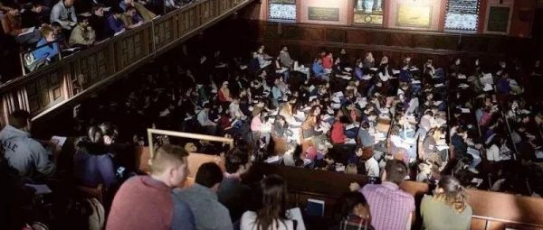 蜂拥而至的学生踏破了教室门槛,学校不得不让一部分人在巴特尔教堂听现场讲座,其余人分散在几个小礼堂里看直播。几周后,他们把上课地址转移到举办交响乐表演的伍尔西音乐厅,总算装下了所有学生。