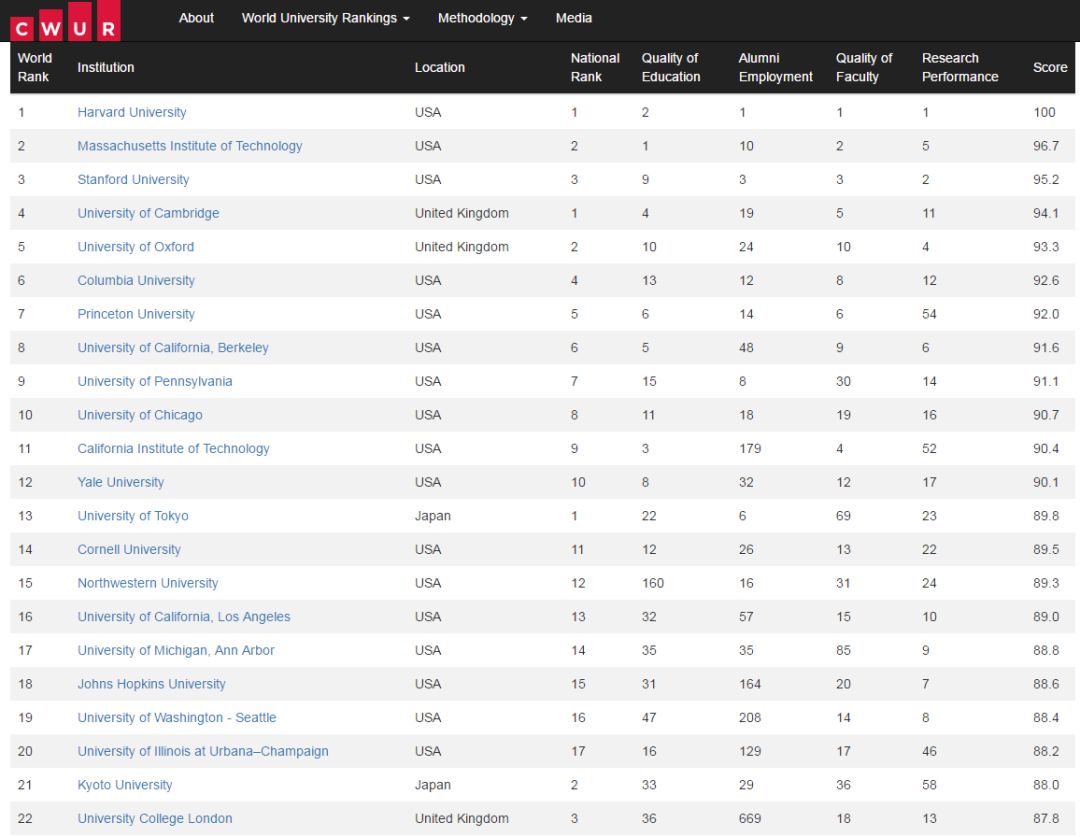 CWUR是由一家总部位于阿联酋的咨询机构自2012年起发布的世界大学排名,在不依赖调查和提交的大学数据的情况下,根据七个因素对大学进行评估:教学质量(25%)、校友就业(25%)、师资质量(10%)、研究成果(10%)、高质量出版物(10%)、影响力(10%)和引文数(10%)。2019年,CWUR的研究方法有所改善,把学习环境和科研也列入同等重视的评估标准当中。