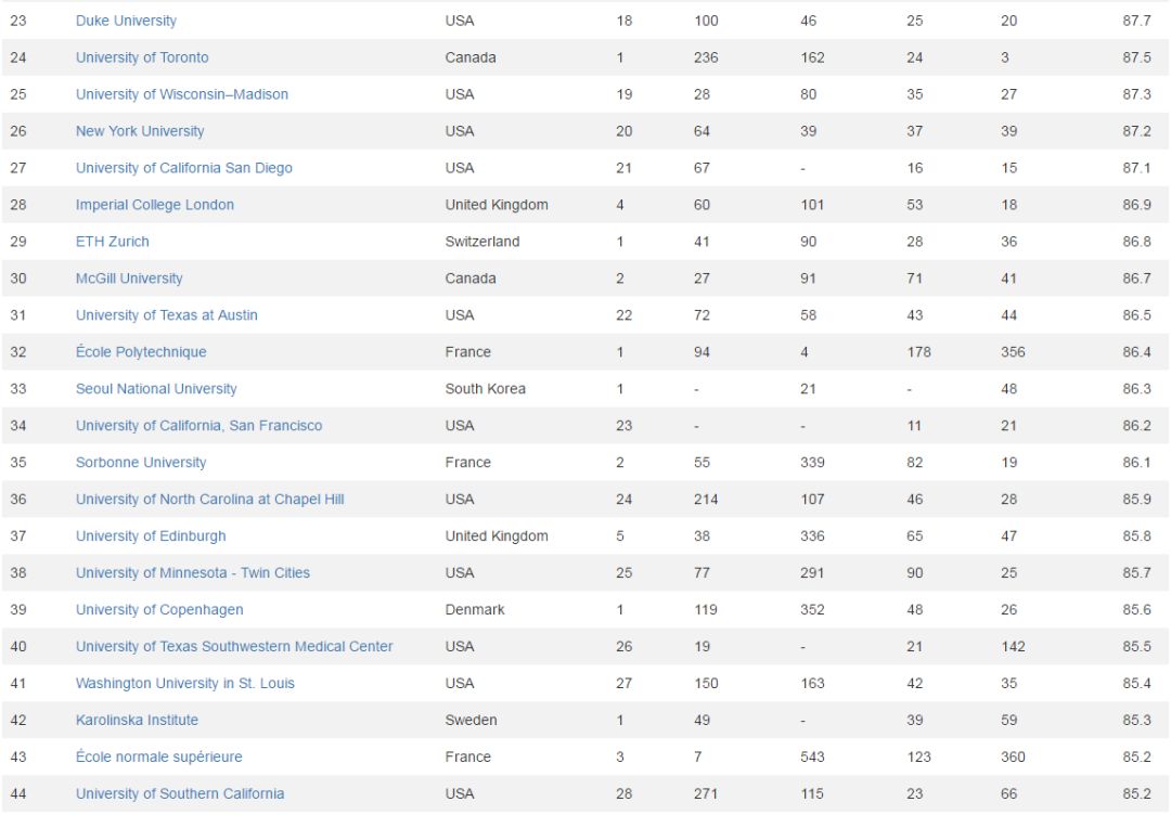 今年,CWUR世界排名前十的大学全部来自美英,其中哈佛大学更是连续八年蝉联榜首,而榜眼和探花则有所易位,麻省理工排名第二,斯坦福大学比去年下降一位,居于第三。其余进入前十名的学校依次为剑桥大学、牛津大学、哥伦比亚大学、普林斯顿大学、加州大学伯克利分校、宾夕法尼亚大学以及芝加哥大学。