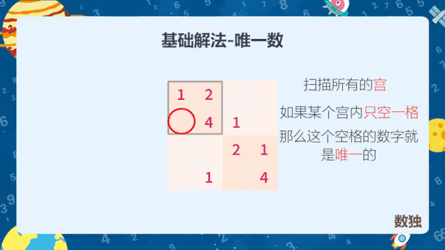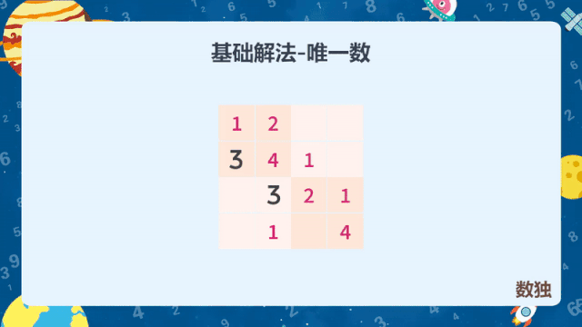 最常见、也最简单的一种解法叫做“唯一数”,如果教孩子数独,一定要从唯一数起步,因为这是后续数独进阶解法的基础。