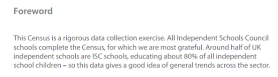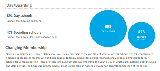 This report is based on a survey carried out in January 2019. All 1,364 schools in UK membership of the constituent associations of ISC (“ISC schools”) completed the survey.