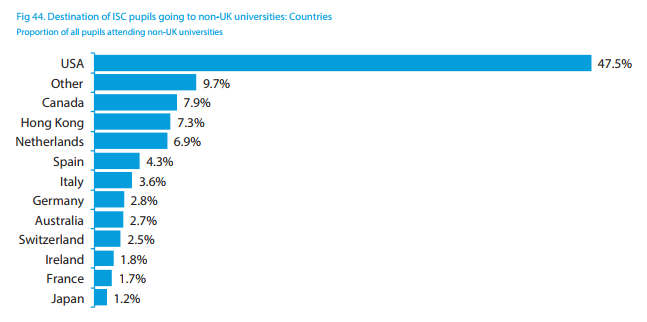 每年约有5%的学生选择英国以外的学校,美国占约50%的比率,远超于其他国家。