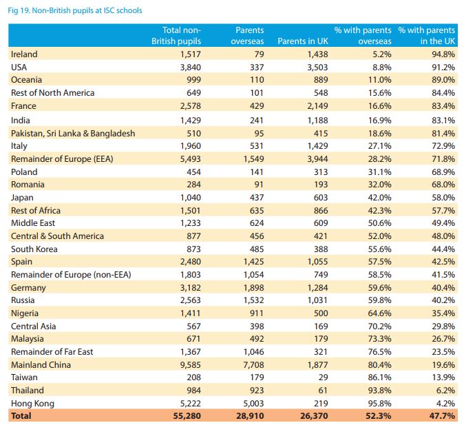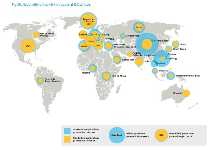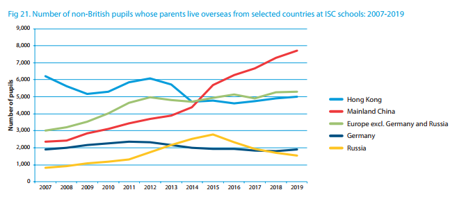中国学生人数在国际生中数量最多。2019年,有9585名中国大陆学生(其中80.4%家长未陪同在英国)和超过5000名香港学生就读英国的私立学校。
