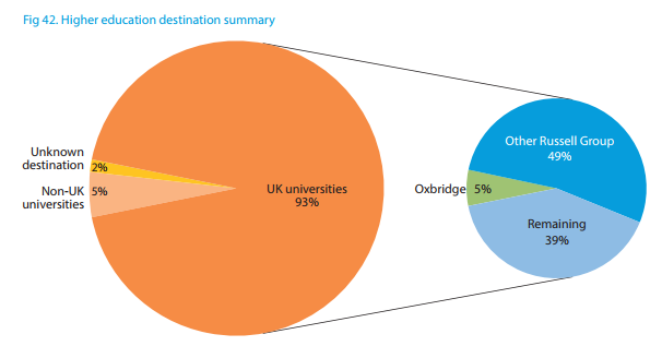 54%私立学校的学生最终会进入英国的罗素集团大学(英国最顶尖的24所大学的统称)。5%的学生进入了牛津或剑桥大学。