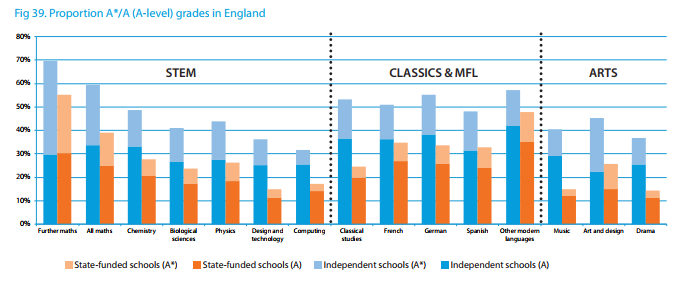 以GCSE的法语和德语成绩为例,9-7分的私立学校学生是公立学校的两倍。