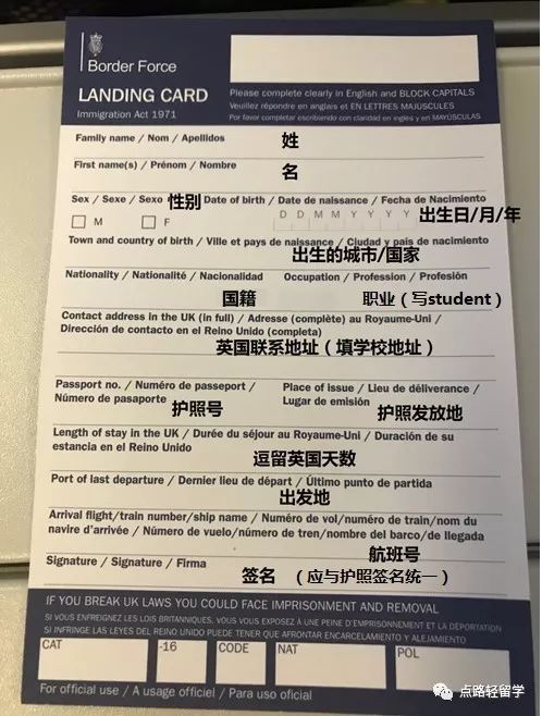 飞机上一般会发放入境卡,所有非欧盟公民都需要填写。有可能是全英文,也有可能是中英双语的,需要用英文填写。如果飞机上没有拿到,可以到入境检查的小桌上拿一张,都是英文的。如果孩子单独前往,可以带他先熟悉一下表格,教他怎么找这些信息。务必随身带一支笔上飞机,这样飞机上就可以填好了,然后夹在护照里面。